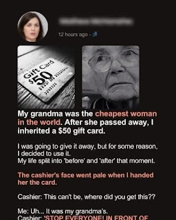 My grandma was the cheapest woman in the world. After she passed away, I inherited a $50 gift card. I was going to give it