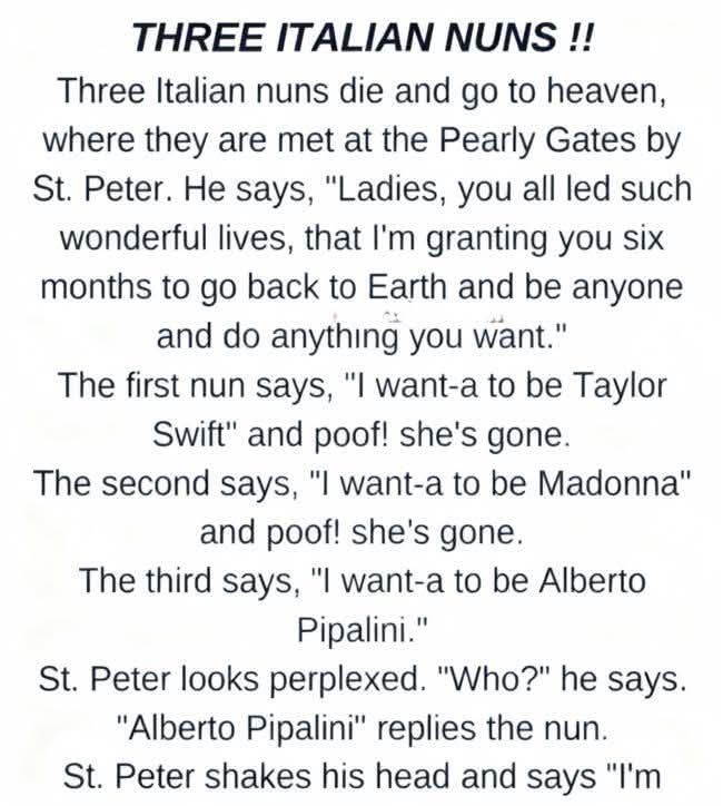 High above the world, at the entrance to an eternal paradise, three Italian nuns found themselves standing before the fabled Pearly Gates. They had lived