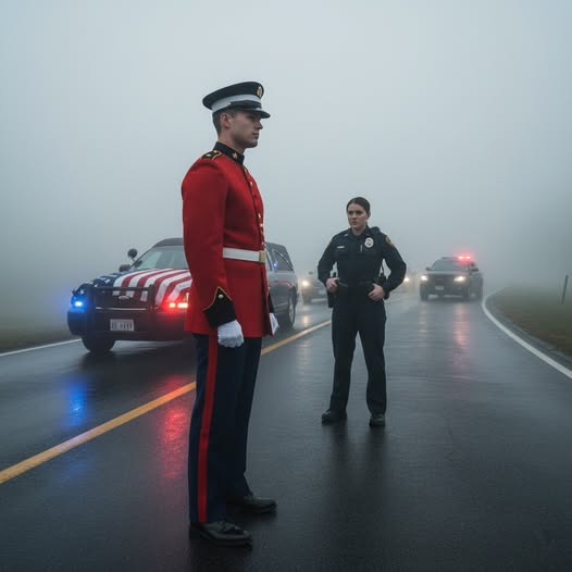 That obstacle appeared as a police cruiser, its lights painting the fog in swirling blue. Officer Laura Bennett stood firm in the center of the intersection, her hand raised. A serious accident had closed the road ahead, and her orders were clear: no one gets through. When Jacob stepped out of the vehicle, his posture ramrod straight, she saw only a man in a ceremonial uniform blocking a critical route. “This road is closed, Sergeant,” she stated, her voice all business. “You’ll need to take the detour.” Jacob’s reply was calm but unyielding. He explained that this was not just a funeral procession; it was the final journey for a soldier who had given his life for his country. A detour was not simply an inconvenience; it was a breach of protocol and a broken promise.