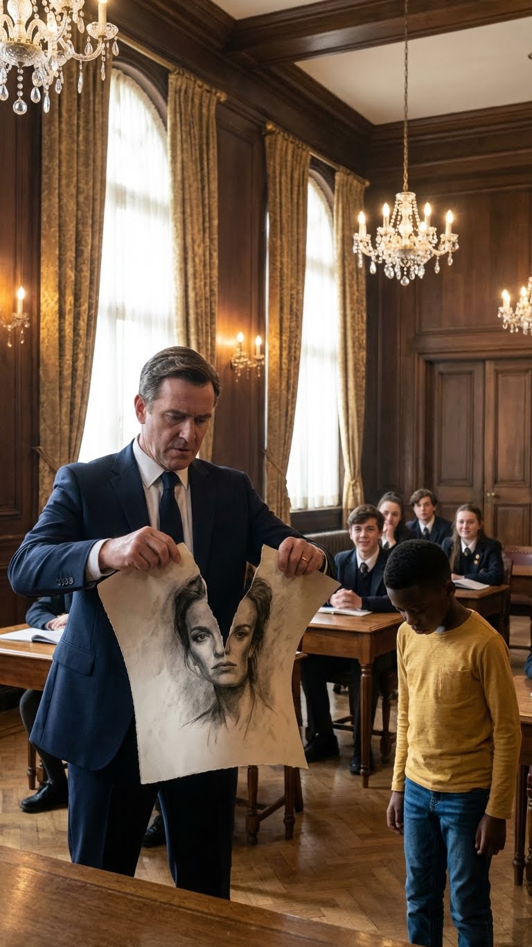 In the end, the portrait found its rightful audience. Displayed in a gallery, the tape scars were not hidden; they were highlighted as part of its integrity. Mateo learned that his perspective—born from a life different from his peers—was not a weakness, but his greatest strength as an artist. The teacher tried to end the conversation with a tear, but he only succeeded in giving the artwork a louder voice and a more powerful platform, proving that true art cannot be silenced.