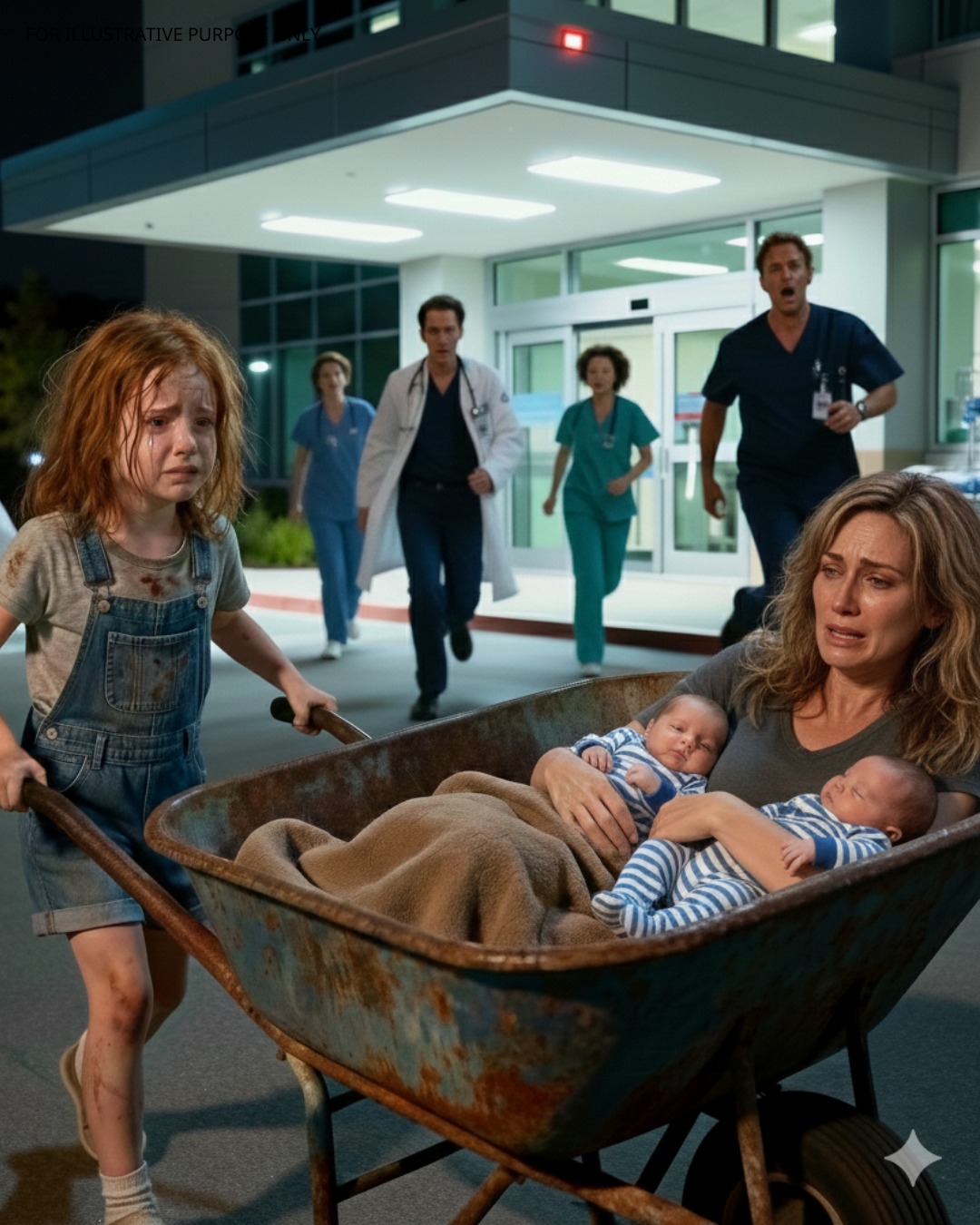 A little girl stood at the entrance, her hands wrapped tightly around the metal handles of an old wheelbarrow. Rust flaked along its edges. One tire sagged, barely holding air. Inside, wrapped in mismatched blankets, lay a woman who looked far too still. Tucked beside her were two newborn babies, their faces small and drawn, their movements weak but alive.