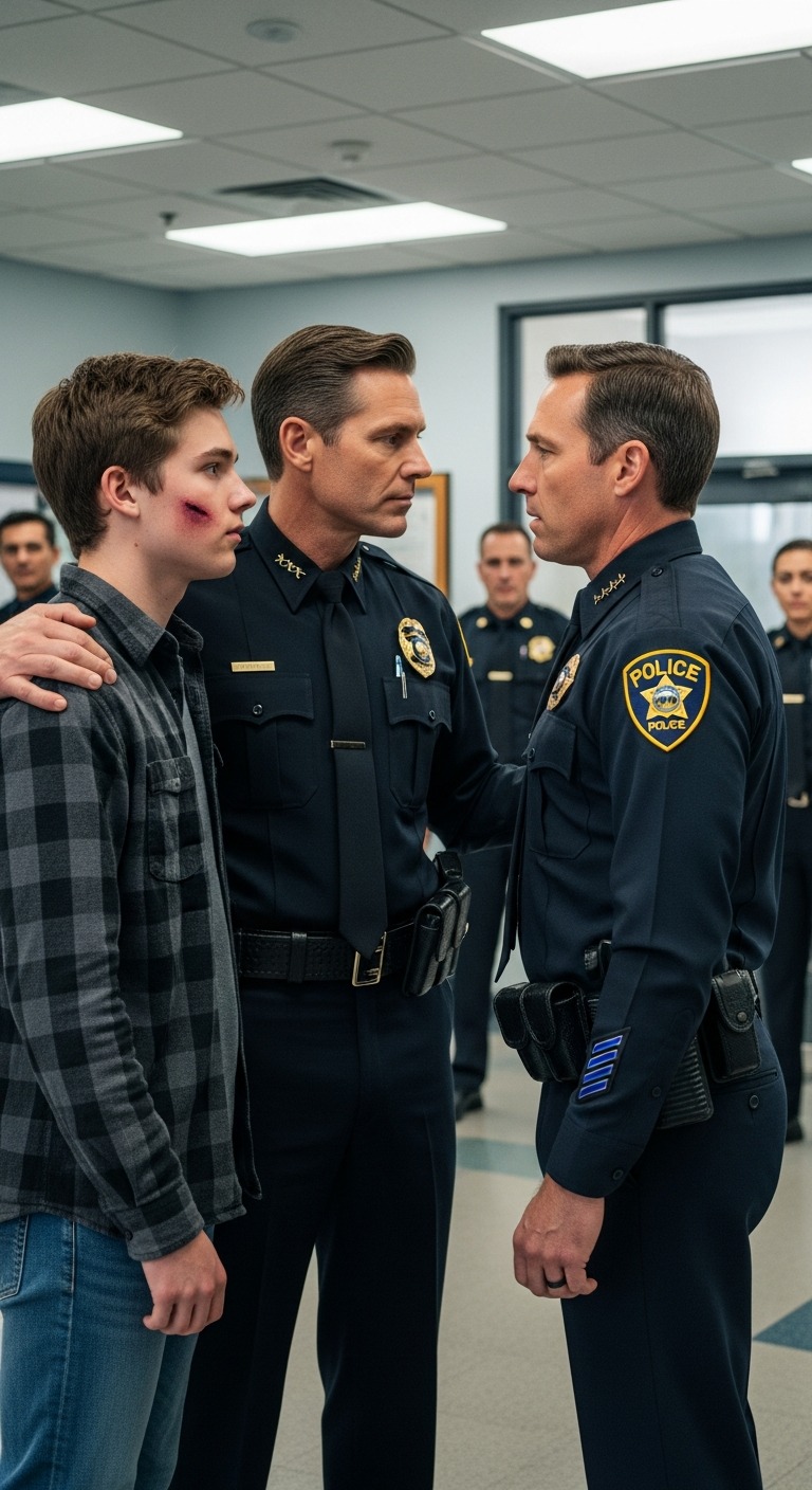 My son called from the police station: “dad, my stepdad beat me and filed a false report. the officers believe him.” i asked which officer—“sergeant miller.” i said, “stay put. twenty minutes.” i didn’t call a lawyer. i walked in wearing my uniform. the sergeant went pale. i calmly asked, “give me fifteen minutes alone with his stepdad.” the room froze…