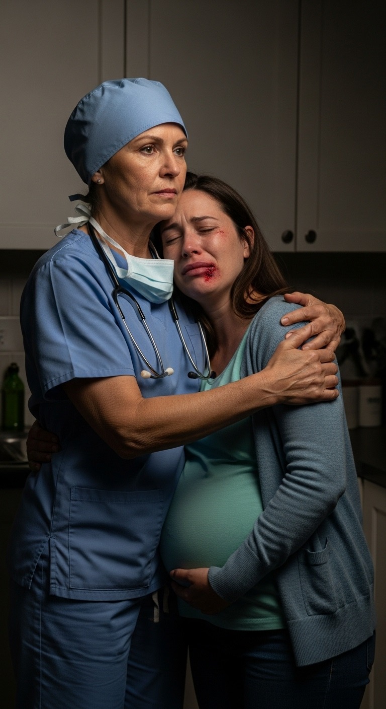 I ran barefoot to the door, throwing on my robe as I went. When I opened it, the sight stopped my insides cold. Emily stood in the doorway, her hands pressed protectively against her huge, nine-month belly. A thin trail of blood ran down from a split eyebrow. Her lip was swollen to twice its normal size, and the horror in her eyes was the kind I hadn’t seen since I worked in trauma and treated car crash victims.