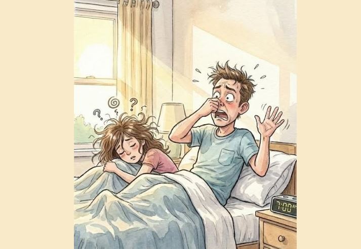 He starts rustling around in the bed looking for it, which of course wakes up his wife, who without thinking asks what’s wrong.