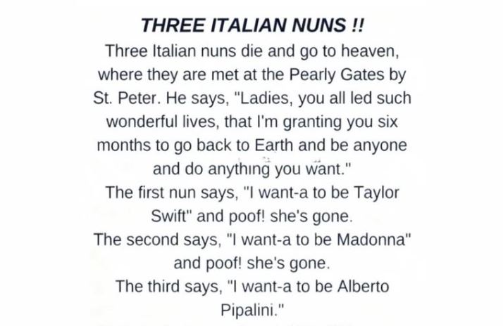 “I want-a to be Alberto Pipalini,” the third nun said softly. St. Peter blinked. He flipped through his records, checked a few heavenly databases, and scratched his head. “I’m sorry, sister,” he said gently, “but I don’t recognize that name. Is he a singer? An artist? A world leader?” The nun smiled wider and calmly pulled out a small newspaper clipping she had somehow brought with her. She pointed to a headline that read: ‘Local Man Alberto Pipalini Named Happiest Person Alive.’ The article explained that Alberto was known not for fame or fortune, but for living a simple, joyful life—running a small family business, laughing often, helping neighbors, and never taking things too seriously.