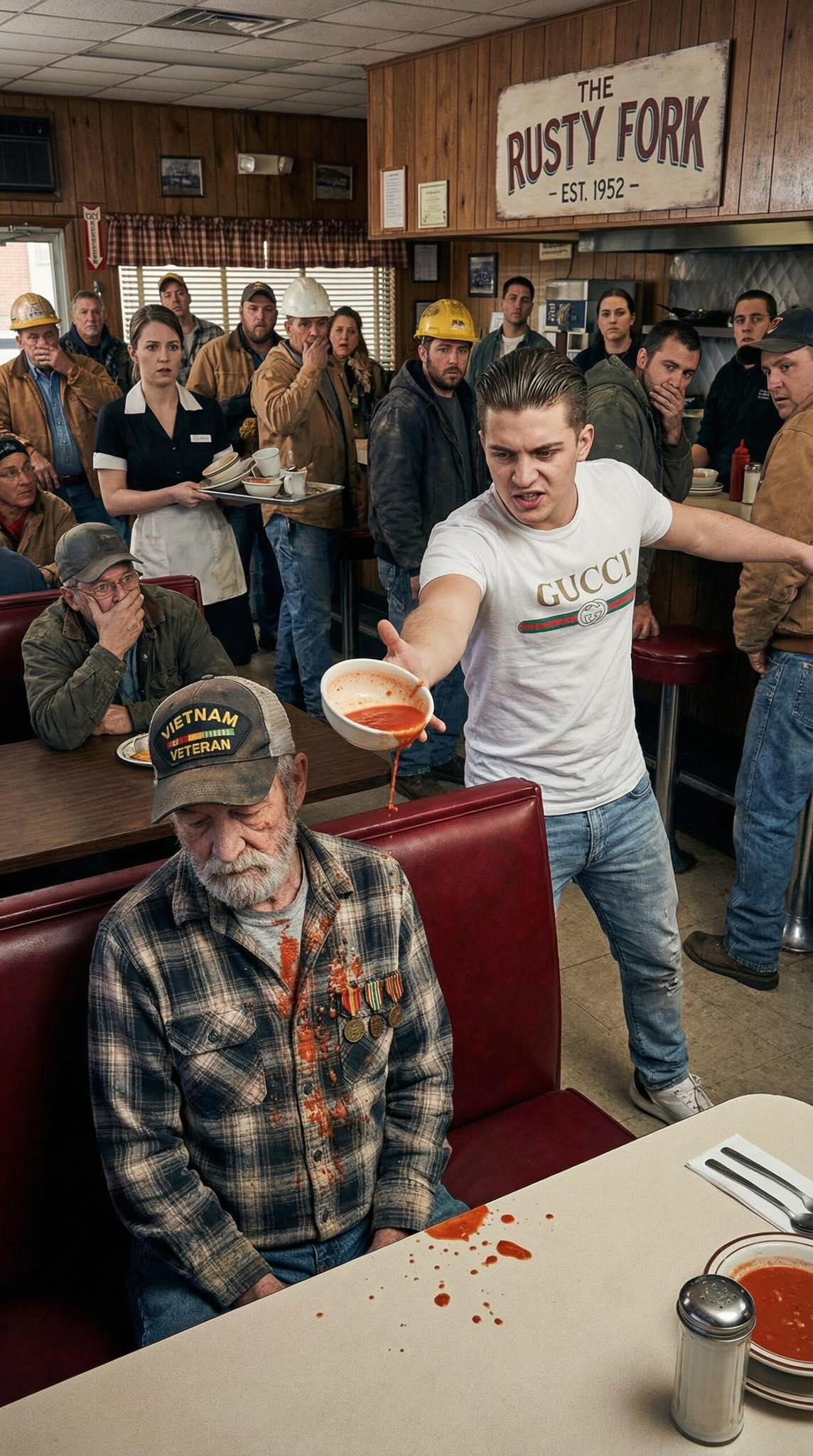 A wealthy brat splashed soup on an elderly veteran over a stained “limited edition” shirt, and the crowd stayed silent upon realizing he was the