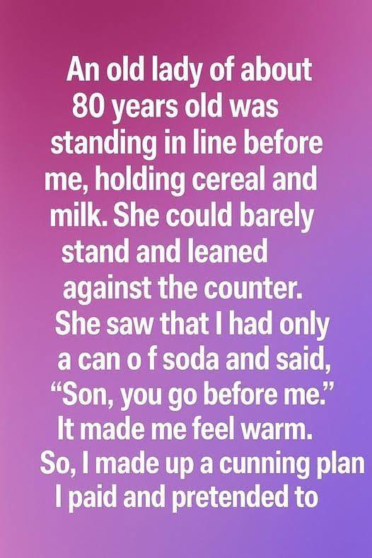 An elderly woman stood ahead of me in the checkout line, her posture bent as if each moment standing required immense focus. In her arms,