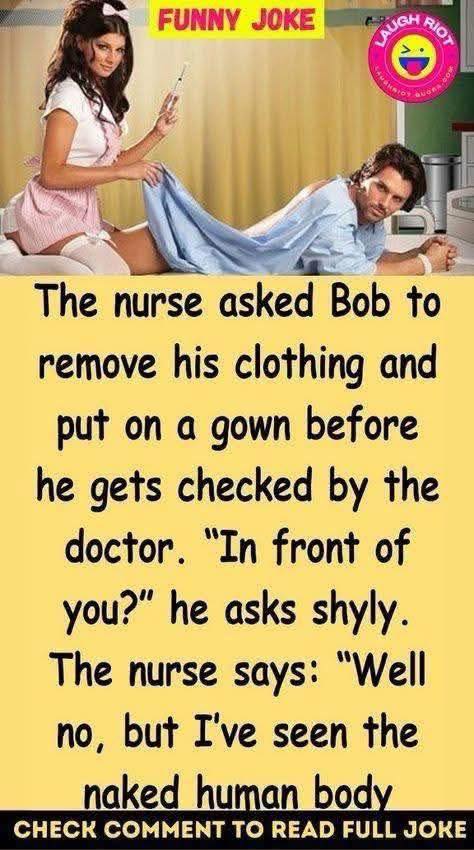 The nurse asked Bob to remove his clothing and put on a gown before he gets checked by the doctor. “In front of you?” he