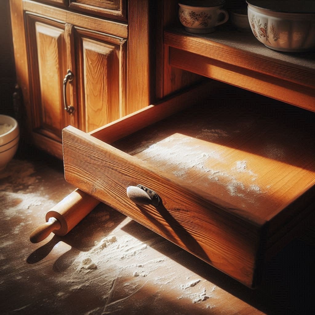 Its clever design provided extra workspace — a hidden surface that slid out when needed and tucked away afterward. For bakers, it was perfect: the wood was gentle enough for dough, sturdy enough for kneading, and easy to clean. It offered just enough texture to keep dough from sticking too much, yet remained smooth under a well-seasoned hand.
