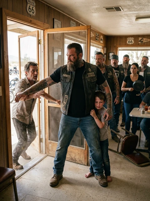 PART 2: I caught the back of his shirt before he touched the handle. The man twisted, swinging wild, but Tiny pinned him against the counter so hard the silverware rattled. The boy was crying behind me now—not loud, not dramatic, just the sound of someone who’d been scared for too long and finally didn’t have to hide it.