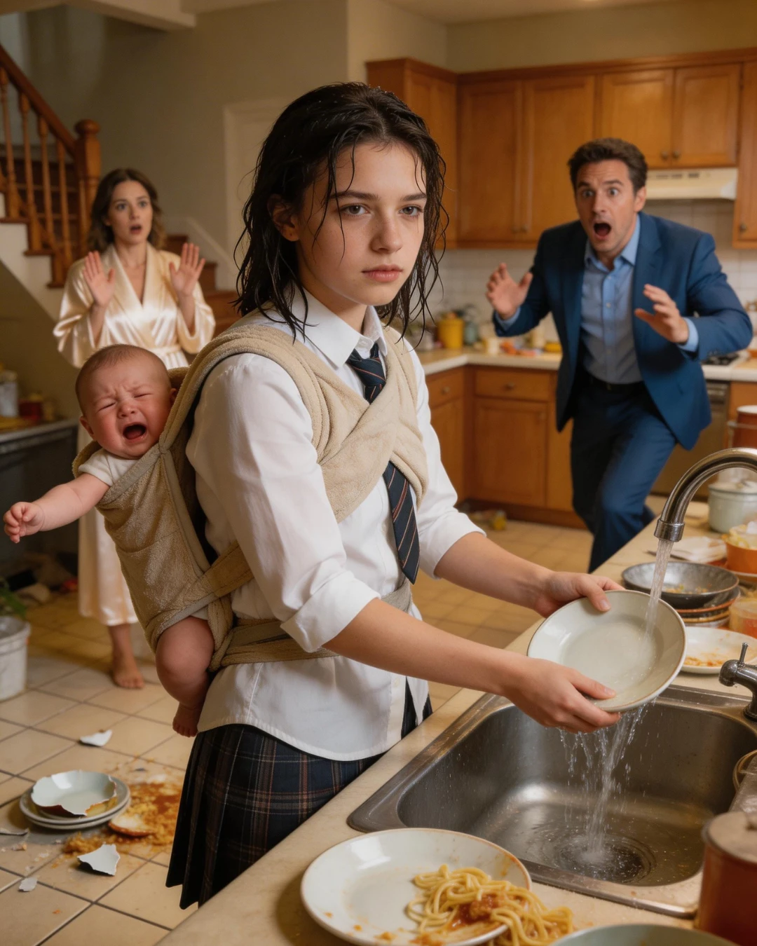 Caroline’s hands trembled as she washed a plate that was too big for her tired arms.