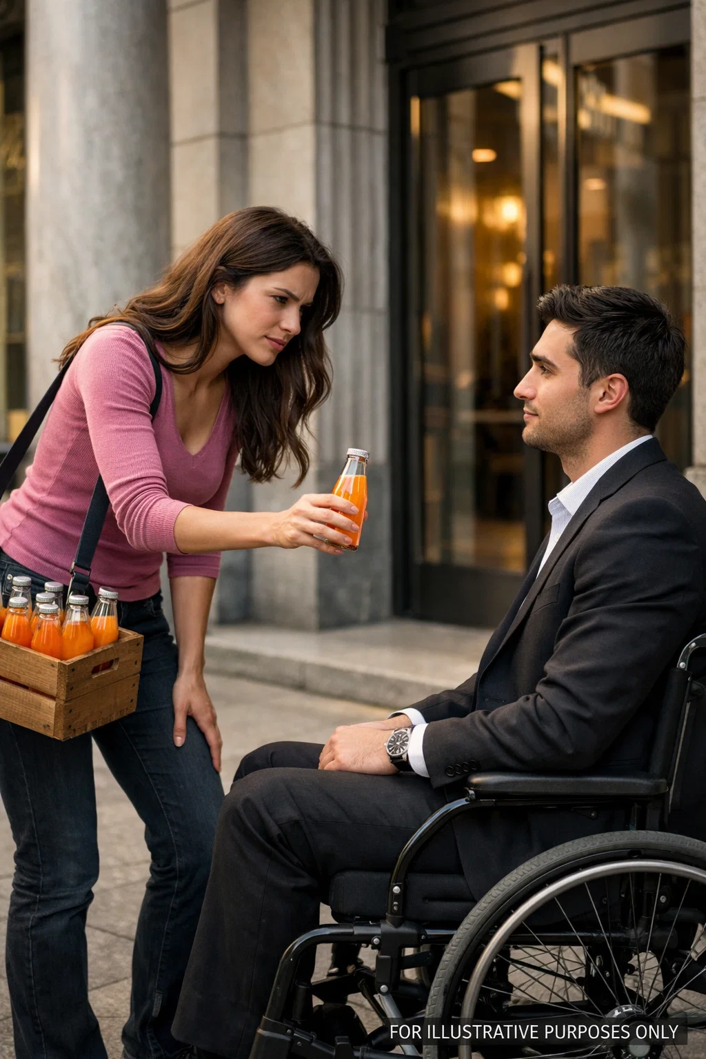 “Sir, would you like some fresh orange juice? Made this morning… only five dollars a liter.” The voice was soft but steady, tired but carrying a kind of hope that made Richard Adams stop for the first time that day. His wheelchair came to a quiet halt in front of the towering glass building that carried his name in gold—Adams Group. He wasn’t a man who stopped. Not for people, not for conversations, not for anything that didn’t belong on a report or a contract. And yet there he was, paused on the sidewalk, looking at a young woman standing directly in his path.